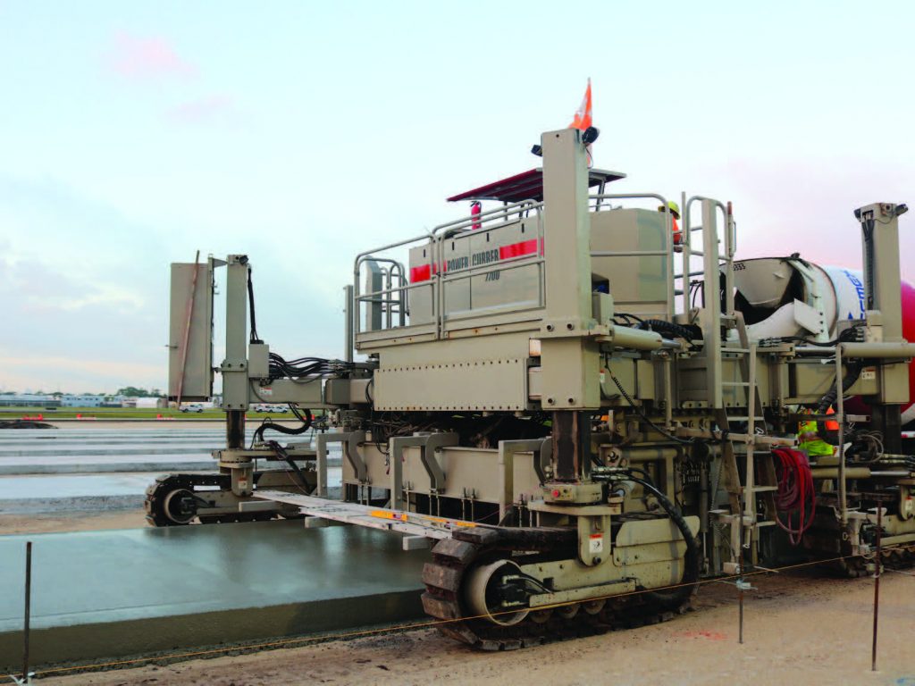 The next Brevard project for their 7700 was another airport facility, Vero Beach Regional Airport, about seventy miles south of Cocoa. A few years earlier, Brevard had completed a ramp for the airport, and the new job was phase two of that project. Some 6,000 cubic yards of concrete were slipformed in 15’ wide sections. They had a total of eighteen pours, each 675 feet long. Ultimately, the new ramp will have hangars built around it, and planes will use the ramp to access the taxiway to runways.